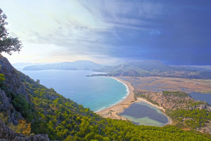 İztuzu sahili dev kaplumbağalar Caretta Carettalar ile dünyaca ünlendi. Kumsalın bir ucunda İztuzu Plajı tesisleri, öteki ucunda da Dalyanağzı Günübirlik Plaj tesisleri yer alıyor. Kumsal kilometrelerce uzanıyor. İztuzu Plajına Dalyan`dan karayoluyla ulaşılıyor. Dalyan`dan çıkan asfalt yol deltayı, sülüngür kıyısını izleyerek köylerden geçerek iniyor plaja. Plaja yaklaştıkça yükselen yol üzerinde fotoğraf çekmeye uygun açıklıklar oluşuyor. Tüm deltayı ve kumsalı içine alan bir panaroma bu.