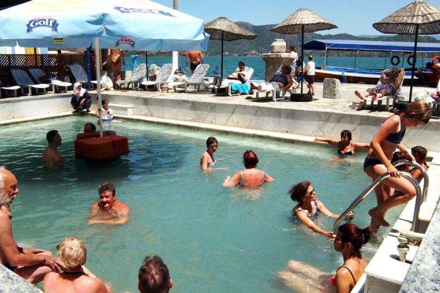 Antik çağlardan beri tedavi merkezi olarak kullanılan Sultaniye Kaplıcası'nda ve önünde gölün altında pek çok tarihi yapı vardır. Kaplıca Dalyan'a kuş uçumu 4 kilometre uzaklıkta. Kanaldan karşıdan karşıya geçmek için araç taşıyan iki ayrı tekne mevcuttur, isteyenler kara yolu ilede ulaşım sağlayabilir. Kaplıca'nın radyoaktif suyunun pek çok hasatlığa iyi geldiği biliniyor.